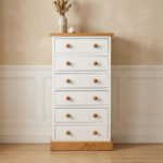 Większość wąskich mebli dostępnych na rynku to lekkie konstrukcje z płyty, które są niestabilne i chwieją się przy wysuwaniu szuflad. Nie musisz godzić się na takie kompromisy, nawet w mniejszym metrażu. Komoda drewniana Retro 9 to nasza odpowiedź na potrzebę solidności w kompaktowym wydaniu.