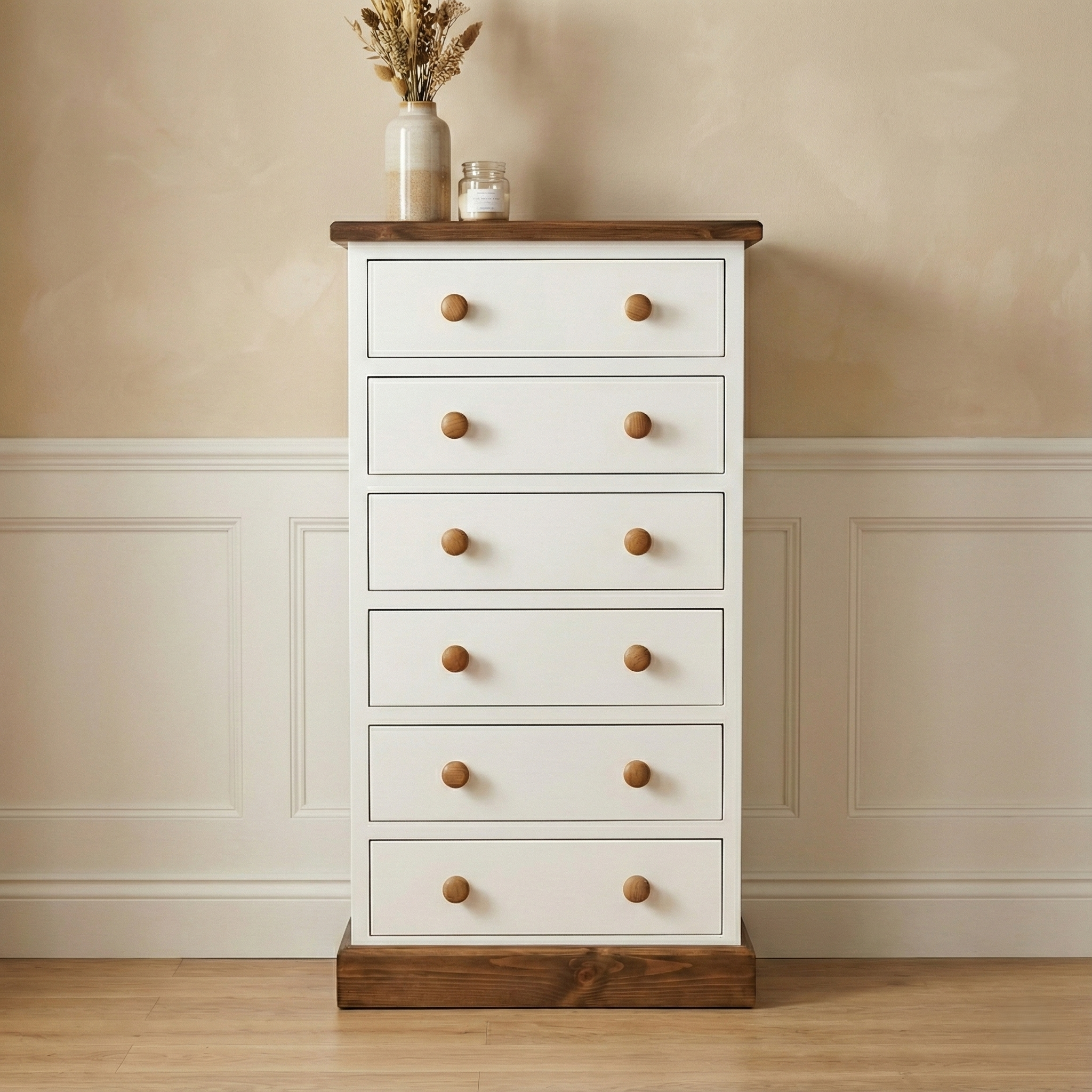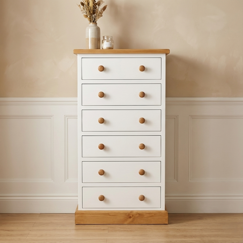 To uczciwy, pionowy mebel, stworzony dla tych, którzy chcą maksymalnie wykorzystać każdy centymetr podłogi, nie rezygnując z trwałości. Zaprojektowaliśmy ją tak, aby była idealnym organizatorem na bieliznę, dokumenty czy drobiazgi, które w końcu znajdą swoje stałe miejsce.