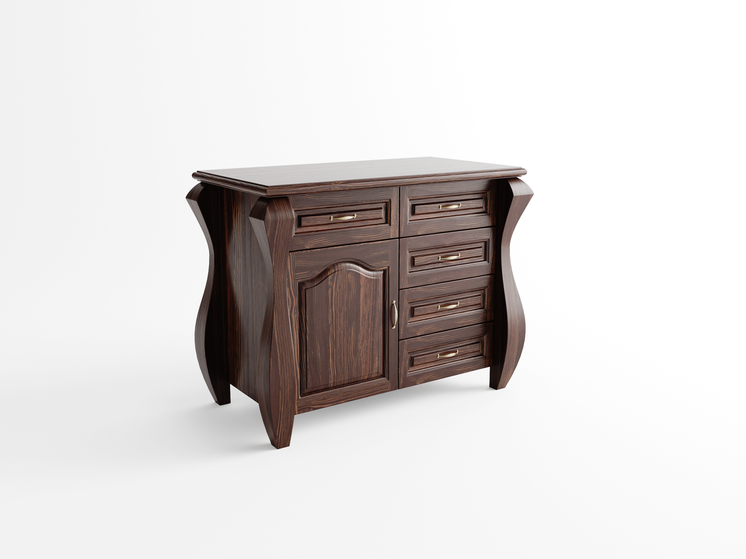 - Materiał: 100% Lite Drewno: Cała komoda – od giętych nóżek, przez korpus, aż po fronty – wykonana jest z naturalnego surowca. To gwarancja stabilności i szlachetnego wyglądu.